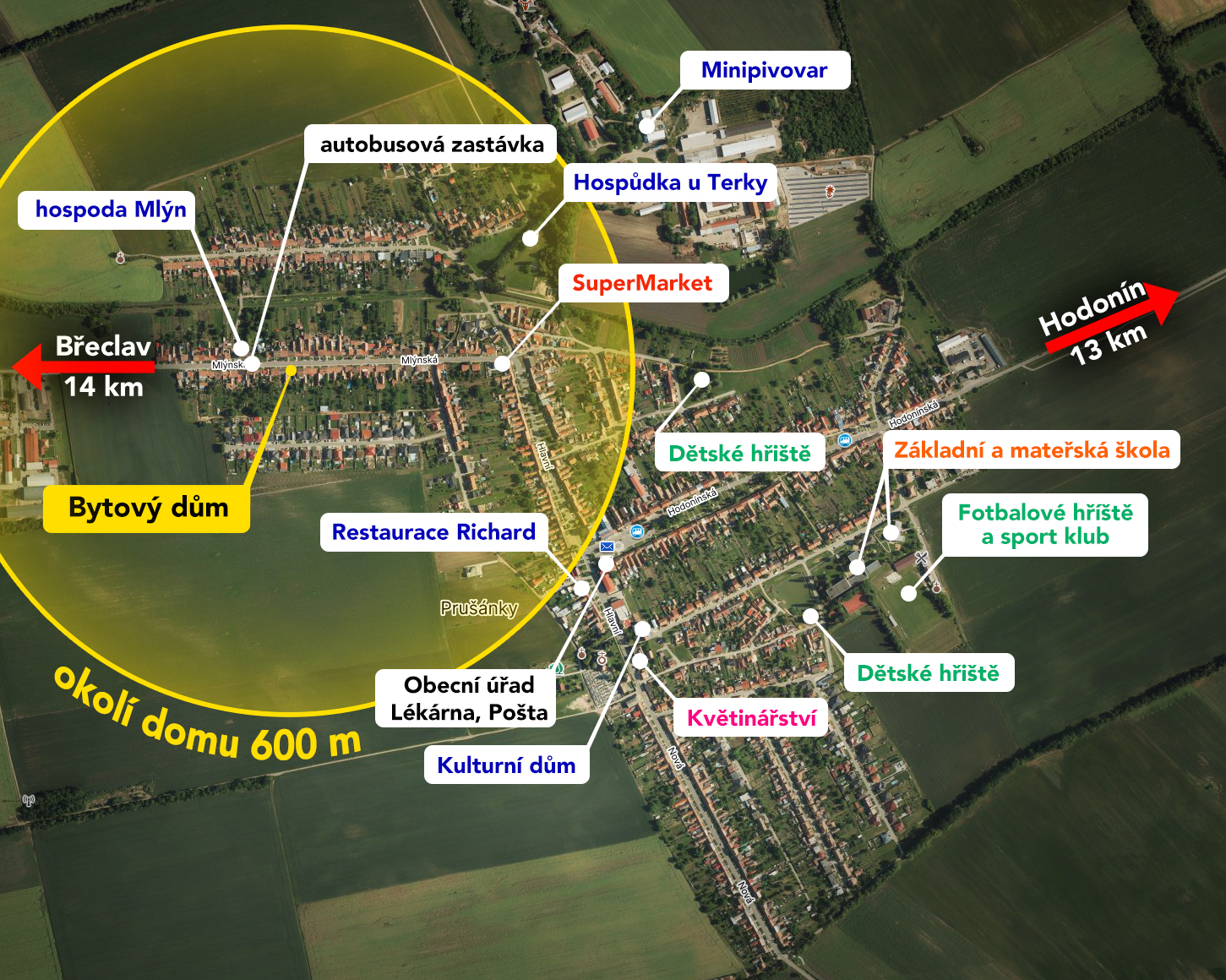 Břeclav (cca 14 km): Díky své poloze je vstupní branou do Lednicko-valtického areálu, který je zapsán na seznamu světového dědictví UNESCO. Město také nabízí široké možnosti nákupů a služeb.