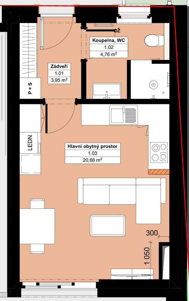 Byty 1+kk nabízí prostorné zádveří, které nabízí dostatek místa pro vestavěnou skříň, pračku a sušičku. Koupelna je vybavena velkým sprchovým koutem, umyvadlem a toaletou, což zaručuje pohodlné denní užívání.