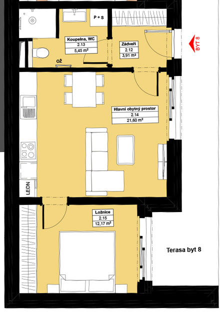 Vstupní část u bytů 2+kk tvoří zádveří s dostatkem prostoru pro vestavnou skříň, což zajišťuje dostatek úložného prostoru pro vaše věci.