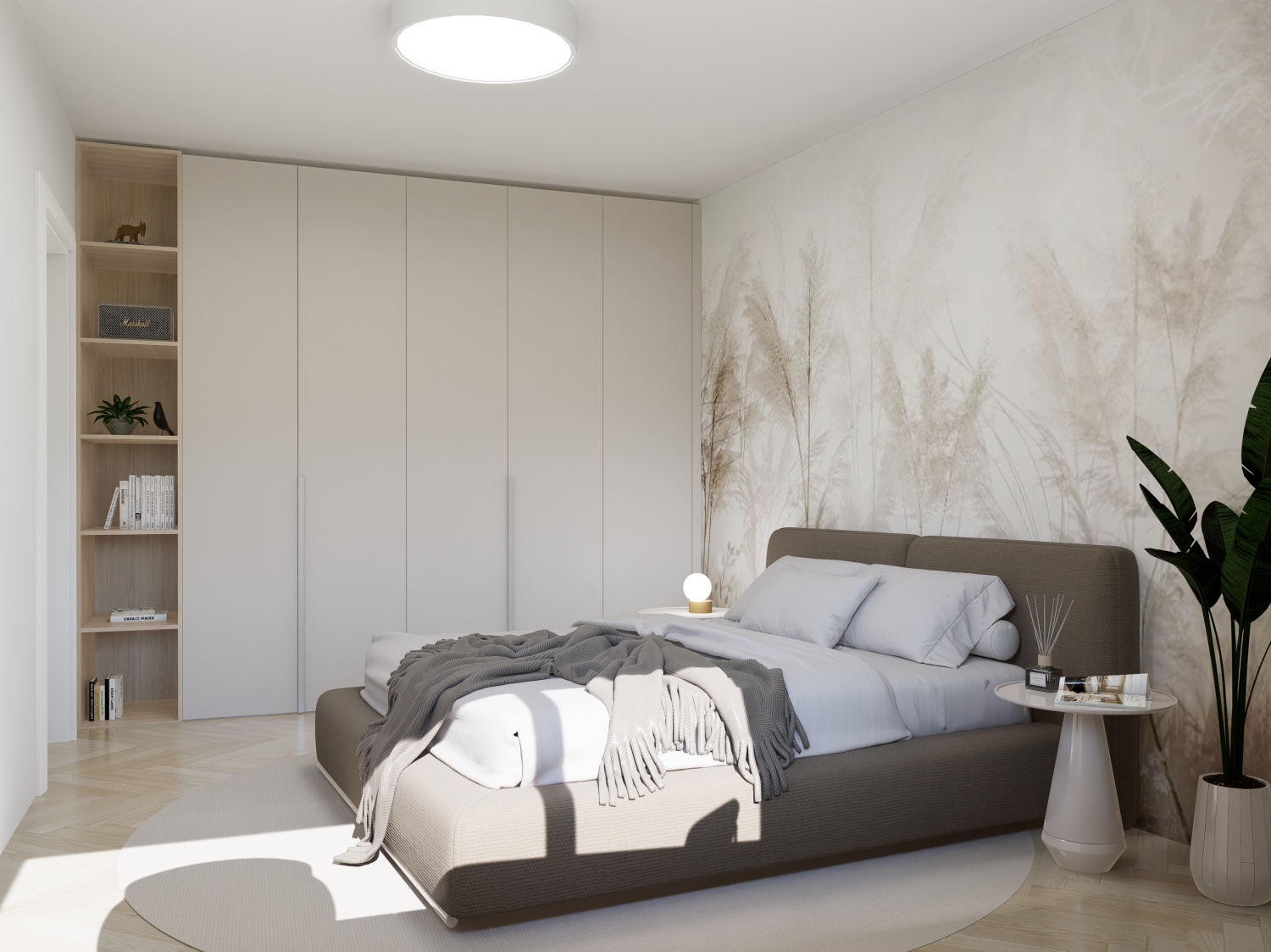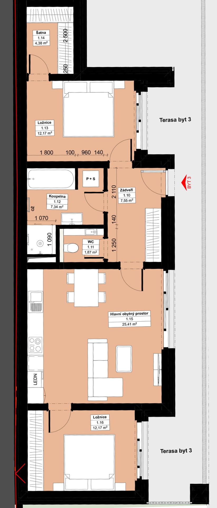 Byt má dvě ložnice – první ložnice je dostatečně prostorná pro manželskou postel a velkou skříň, ideální pro pohodlný odpočinek. Druhá ložnice je vybavena vlastní šatnou, což nabízí perfektní úložný prostor pro oblečení a doplňky.