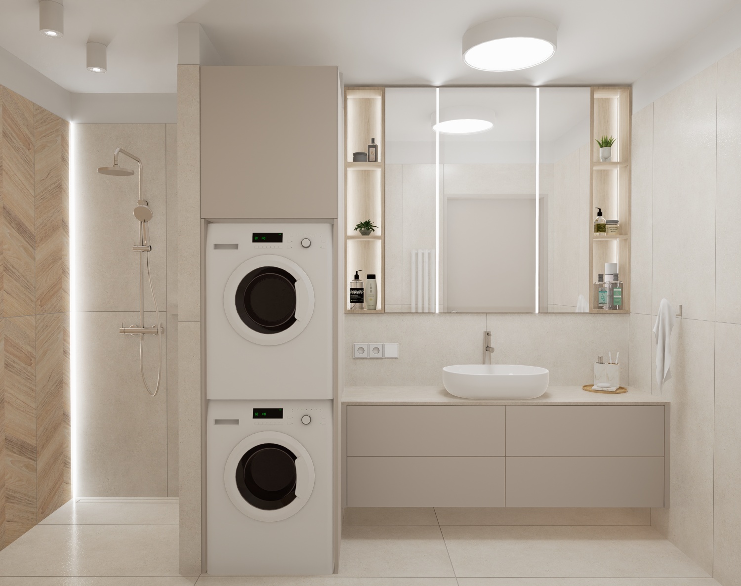 Koupelna je vybavena moderním sprchovým koutem, umyvadlem a toaletou, navíc je zde i prostor pro pračku a sušičku, což přispívá k pohodlnému a funkčnímu užívání bytu.