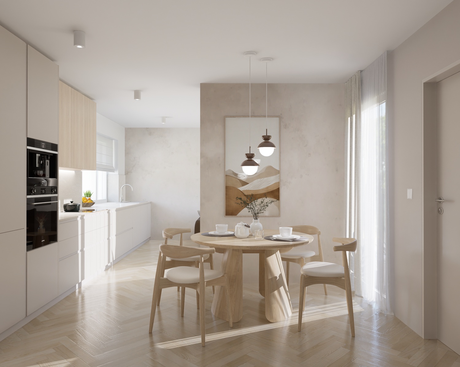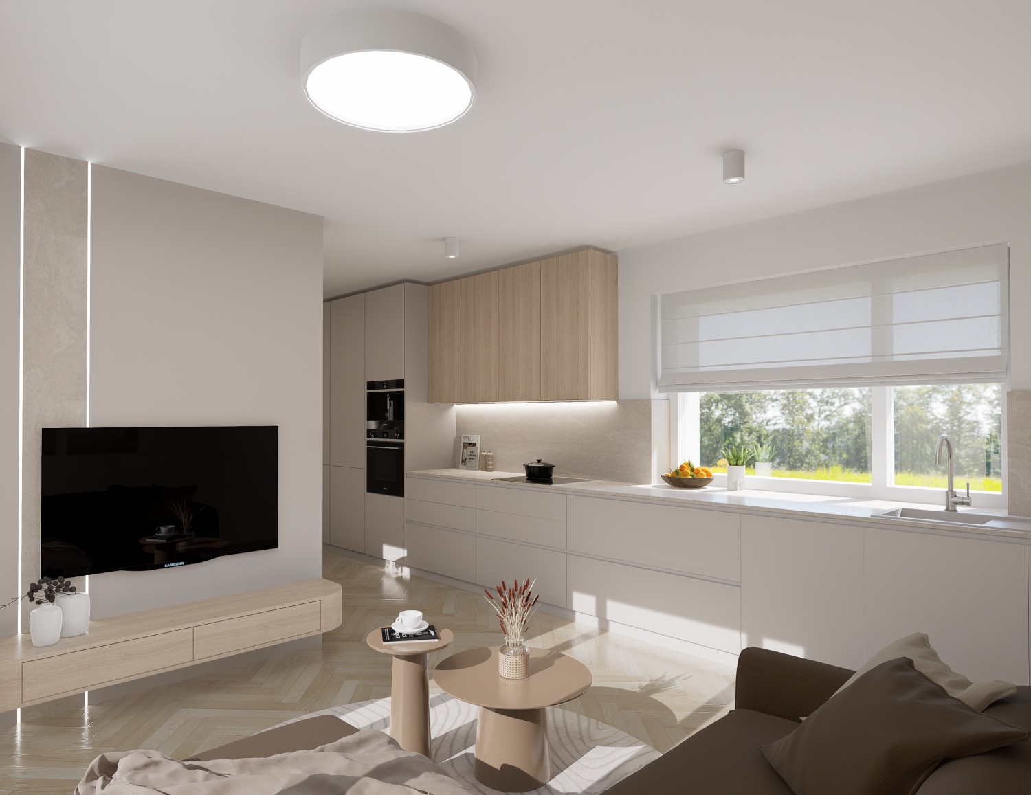 Obývací pokoj o více než 25 m² je srdcem tohoto bytu. Nachází se zde prostorná kuchyňská linka, která poskytuje dostatek prostoru pro přípravu jídel, a zároveň je zde i prostor na jídelní stůl a pohodlnou sedačku s televizí, což vytváří ideální místo pro relaxaci a rodinné chvíle.